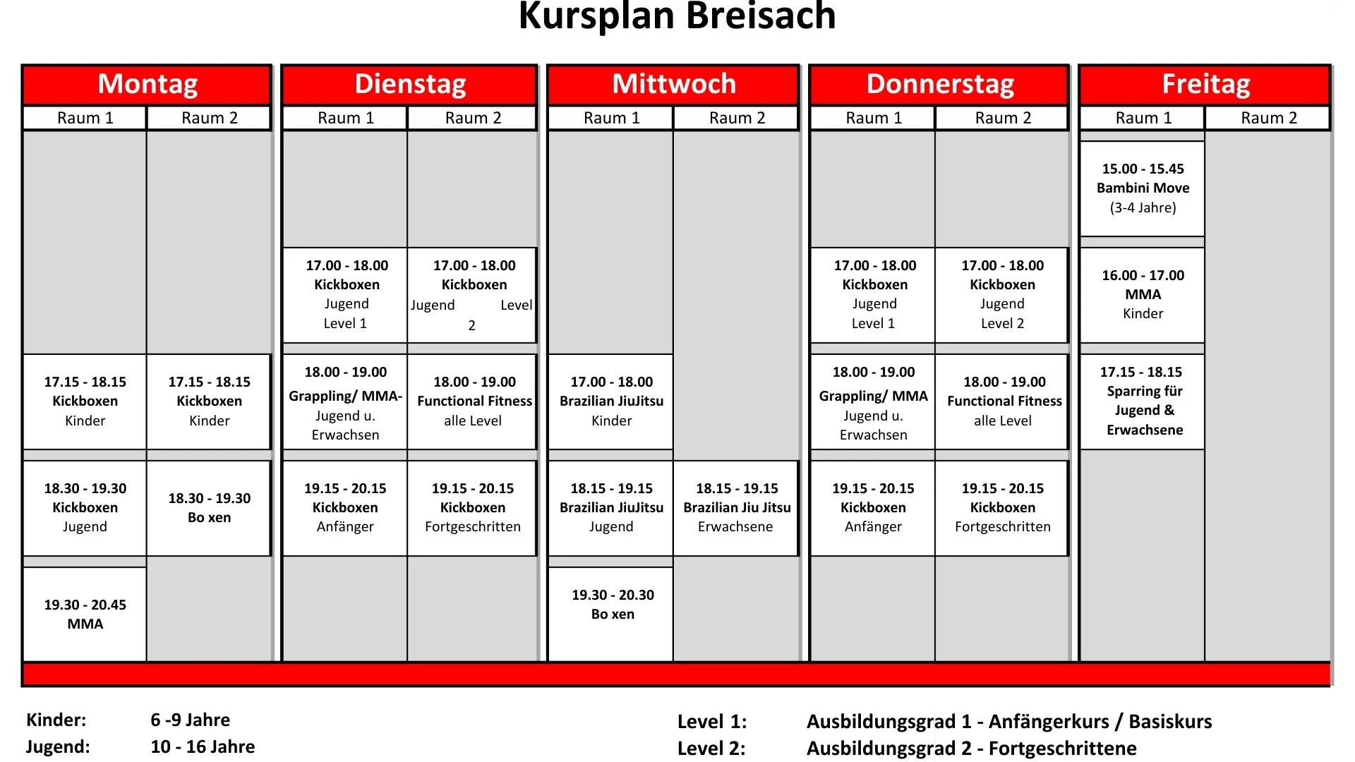 Das Gym in Breisach verfügt über eine vielseitige Ausstattung für jedes Trainingsziel: ein separater Boxring, Käfig Wände, ein eigener Kraftbereich, Boxsäcke und funktionelles Equipment. Ergänzt wird das Ganze durch moderne Tools wie Air Bikes, Kraftgeräte, Springseile und vieles mehr. Ob du an Technik, Kraft oder Ausdauer arbeiten willst, hier hast du alles, was du brauchst.