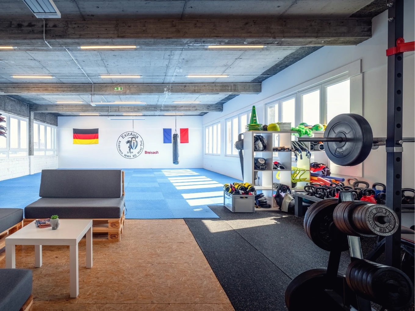 In Breisach erwarten dich drei helle, funktionale Trainingshallen, die alle optimal für den Kampfsport ausgestattet sind. Eine der Hallen ist zusätzlich mit einem integrierten Kraftbereich kombiniert, den du während unserer Öffnungszeiten frei nutzen kannst.